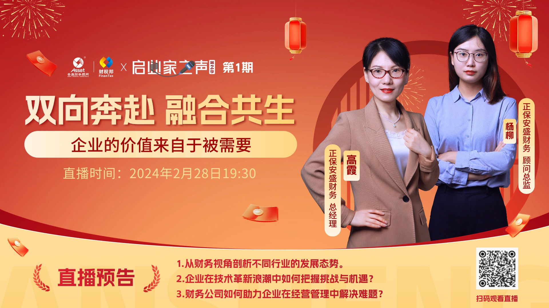 2024年2月28日19:30,正保安盛財(cái)務(wù)視頻號推出《啟業(yè)家之聲》第二季第1期《【雙向奔赴 融合共生】企業(yè)的價(jià)值來自于被需要》龍年首場主題直播,邀請正保安盛財(cái)務(wù)總經(jīng)理高霞和咨詢顧問中心總監(jiān)楊柳與大家線上交流互動(dòng)。