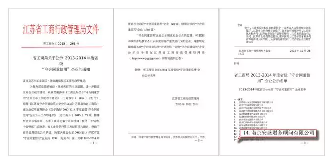 2015年11月,南京安盛財(cái)務(wù)榮獲江蘇省工商行政管理局頒發(fā)的省級(jí)“守合同重信用”公示證書
